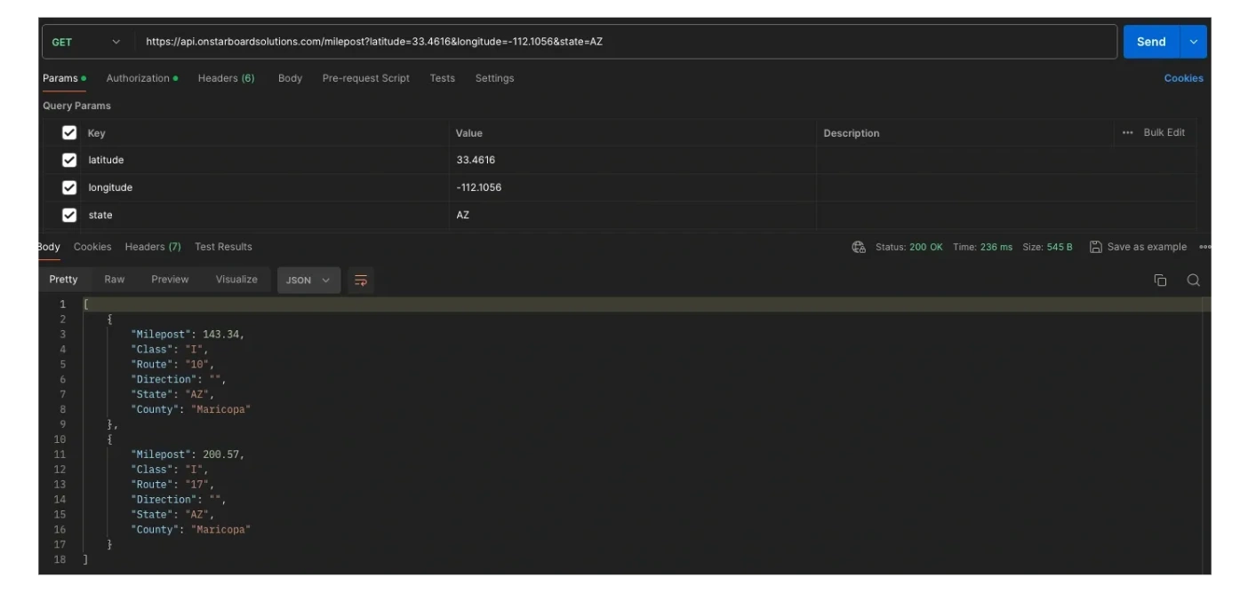 Call the /milepost endpoint. This endpoint makes an HTTP GET request to retrieve information related to a specific geographical location. The request is required to include the "latitude" and "longitude" as query parameters. Upon a successful request, the server will respond with a status code of 200 and a JSON object containing the result data in an array format.
